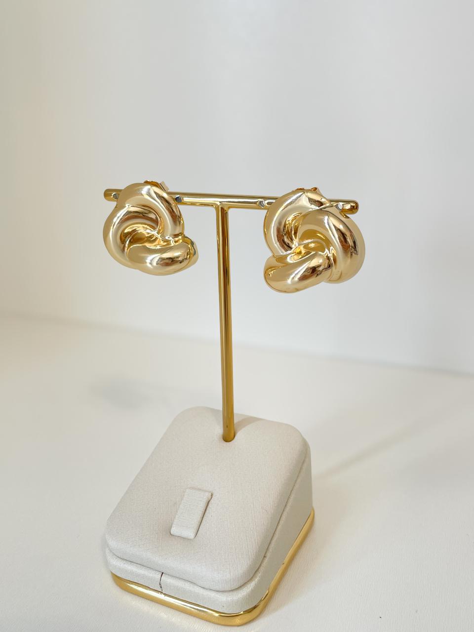 Brinco de nó trançado e texturizado, liso, curvo, banhado a ouro. Com nuances texturizadas no metal, esta peça transita com versatilidade, adaptando-se tanto a momentos descontraídos quanto aos mais formais.