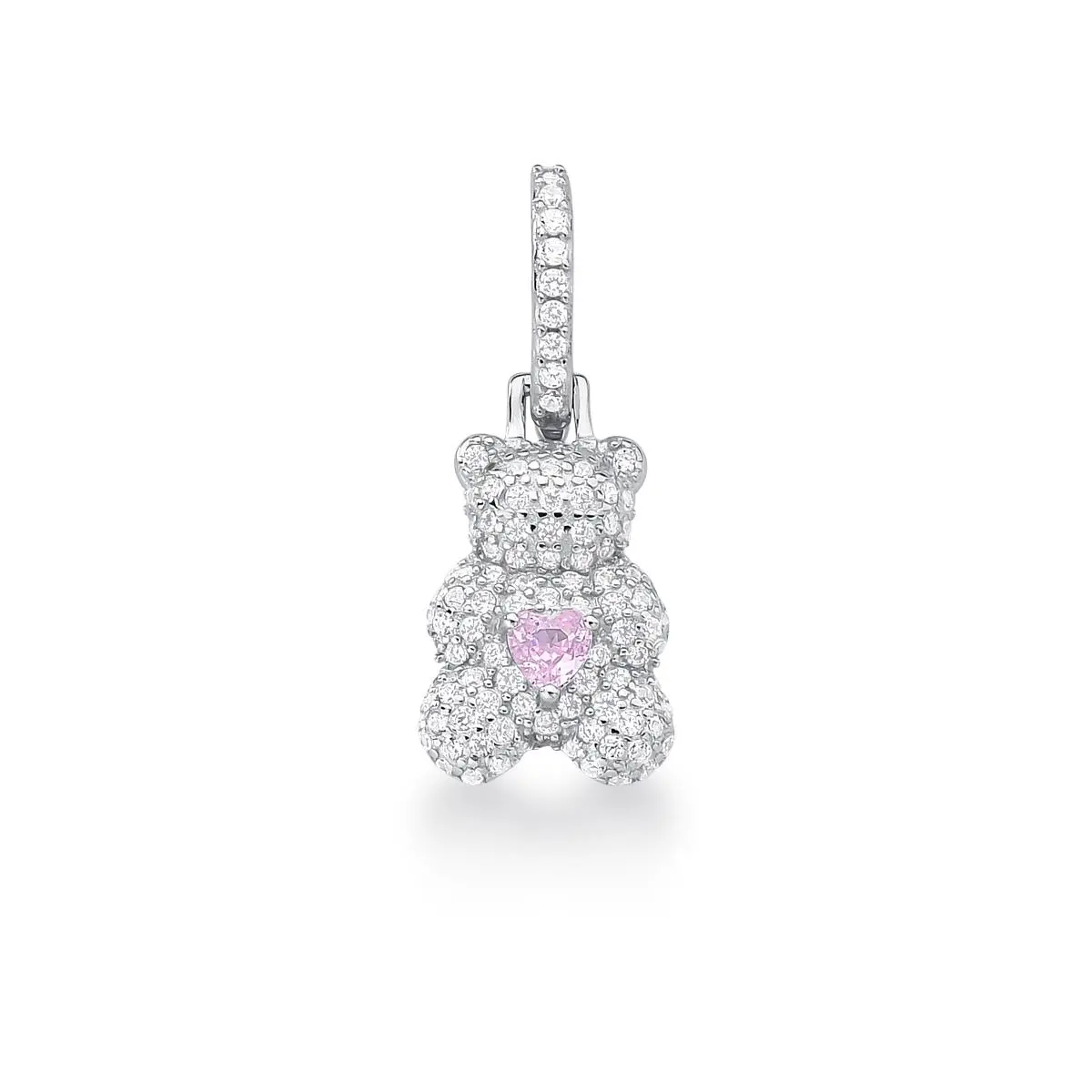 Pingente de urso cravejado de zircônias e cristal de coração ROSA com fecho de click prata 925 banho de ródio. Além de permitir chamar muita atenção devido ao seu brilho proporciona um look cheio de charme.